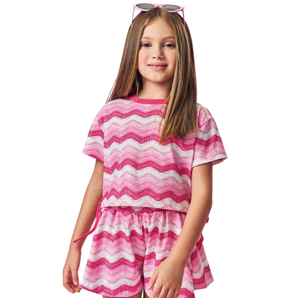 Estampa 3D que dá vida e movimento às listras onduladas Blusa com amarrações laterais, para um ajuste perfeito e cheio de estilo Shorts colegial que une conforto e praticidade para os dias mais agitados Cor rosa vibrante que combina com a alegria e energia das meninas Perfeito para festas, passeios no parque ou aquele dia especial em família, esse conjunto vai fazer sua pequena querer repetir o look todos os dias — e quem pode culpá-la?